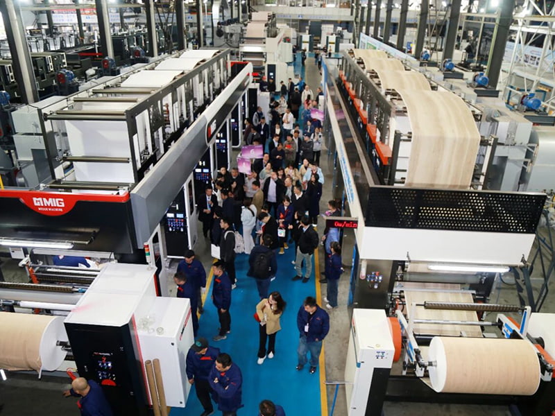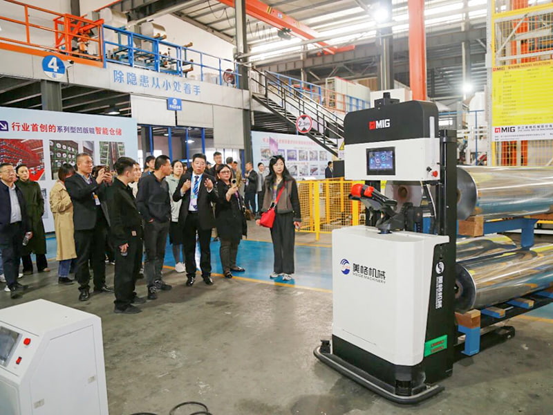 11月13日,与会代表走进美格机械实地参观,深入考察这家在装饰纸印刷装备领域深耕二十余年的国家高新技术企业。在生产车间中,高精度凹版印刷设备稳定运行,AGV机器人沿预定路径自动配送物料,展现了企业在自动化与信息化融合方面的系统能力。参观代表边走边交流,细致了解设备性能与工艺流程,现场气氛热烈。